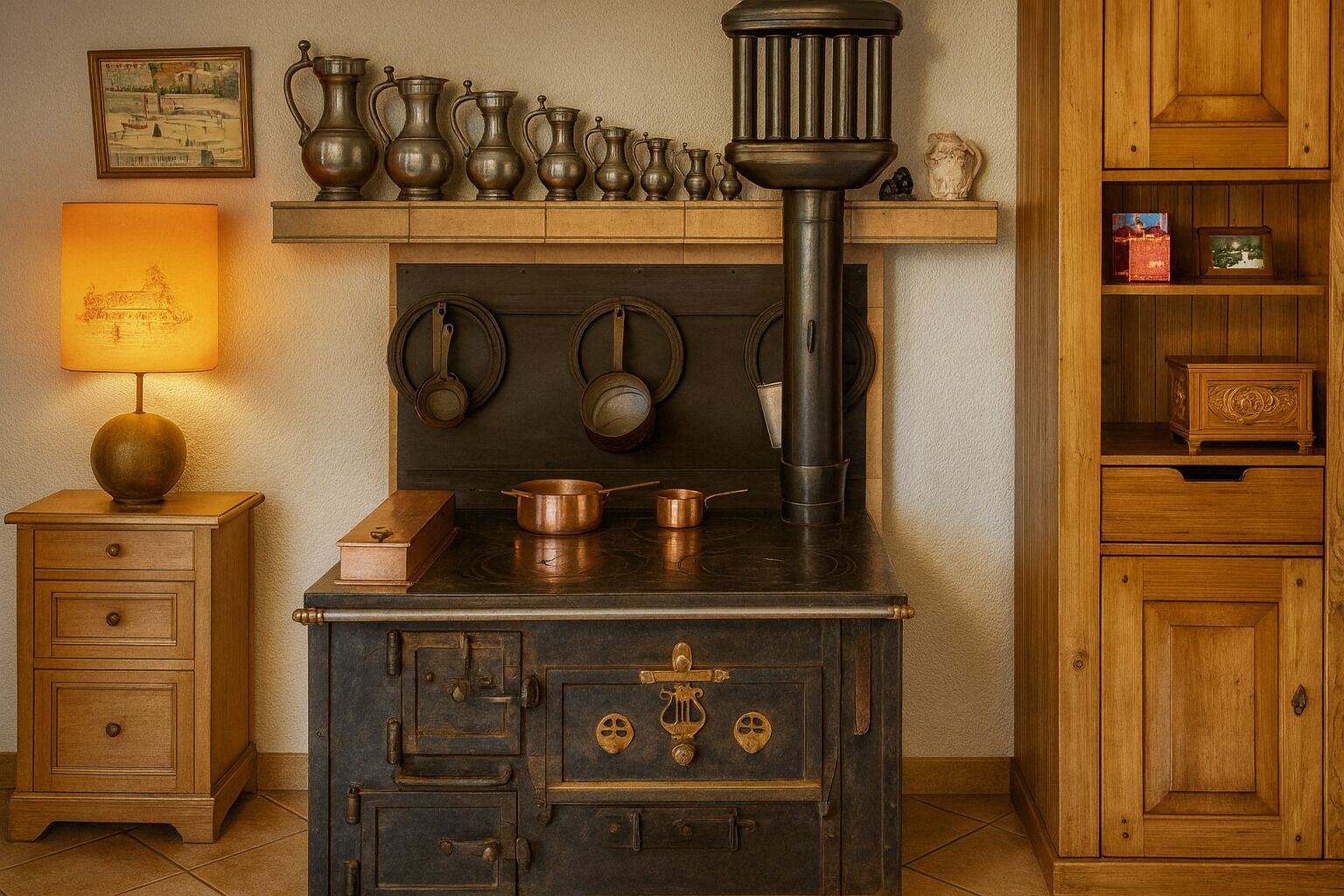 - Une pièce à vivre avec poêle à bois et accès extérieur menant à la terrasse