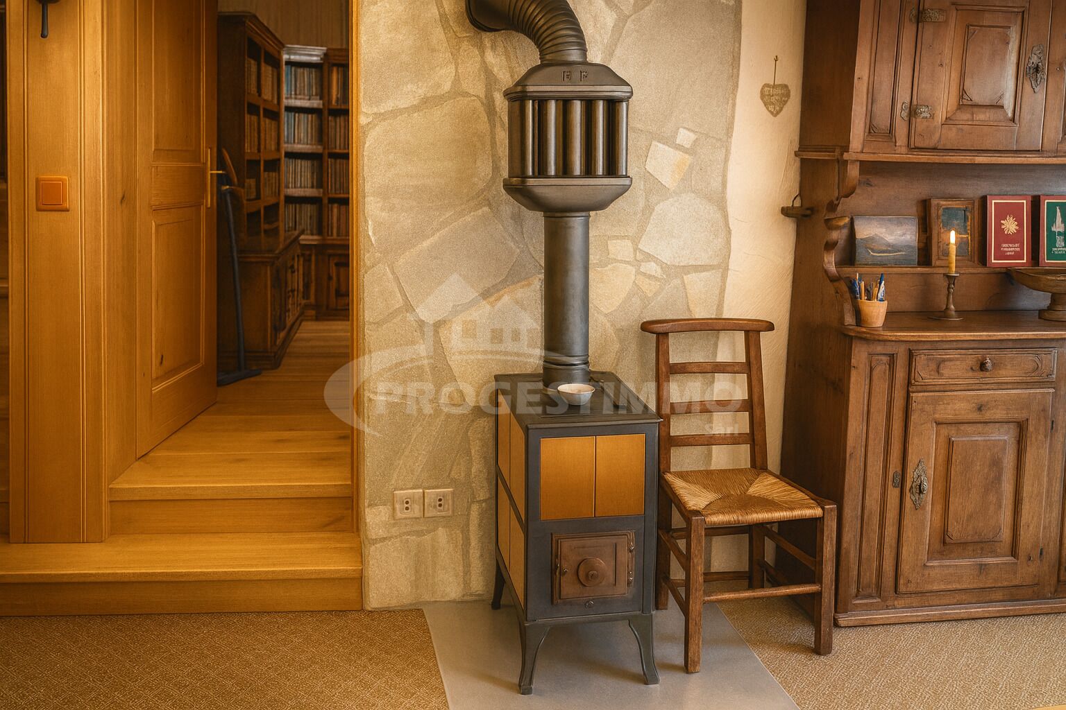 - Une pièce à vivre avec un poêle à bois et accès extérieur menant au balcon