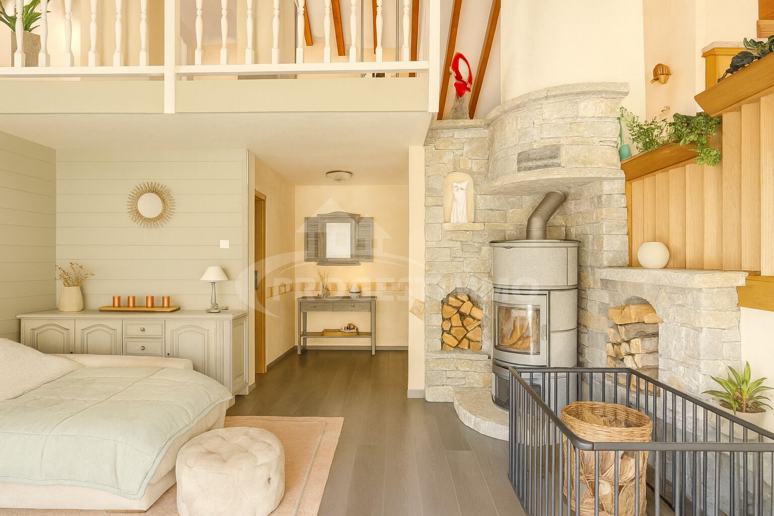 - Une pièce à vivre avec un poêle à bois et un accès menant au second balcon