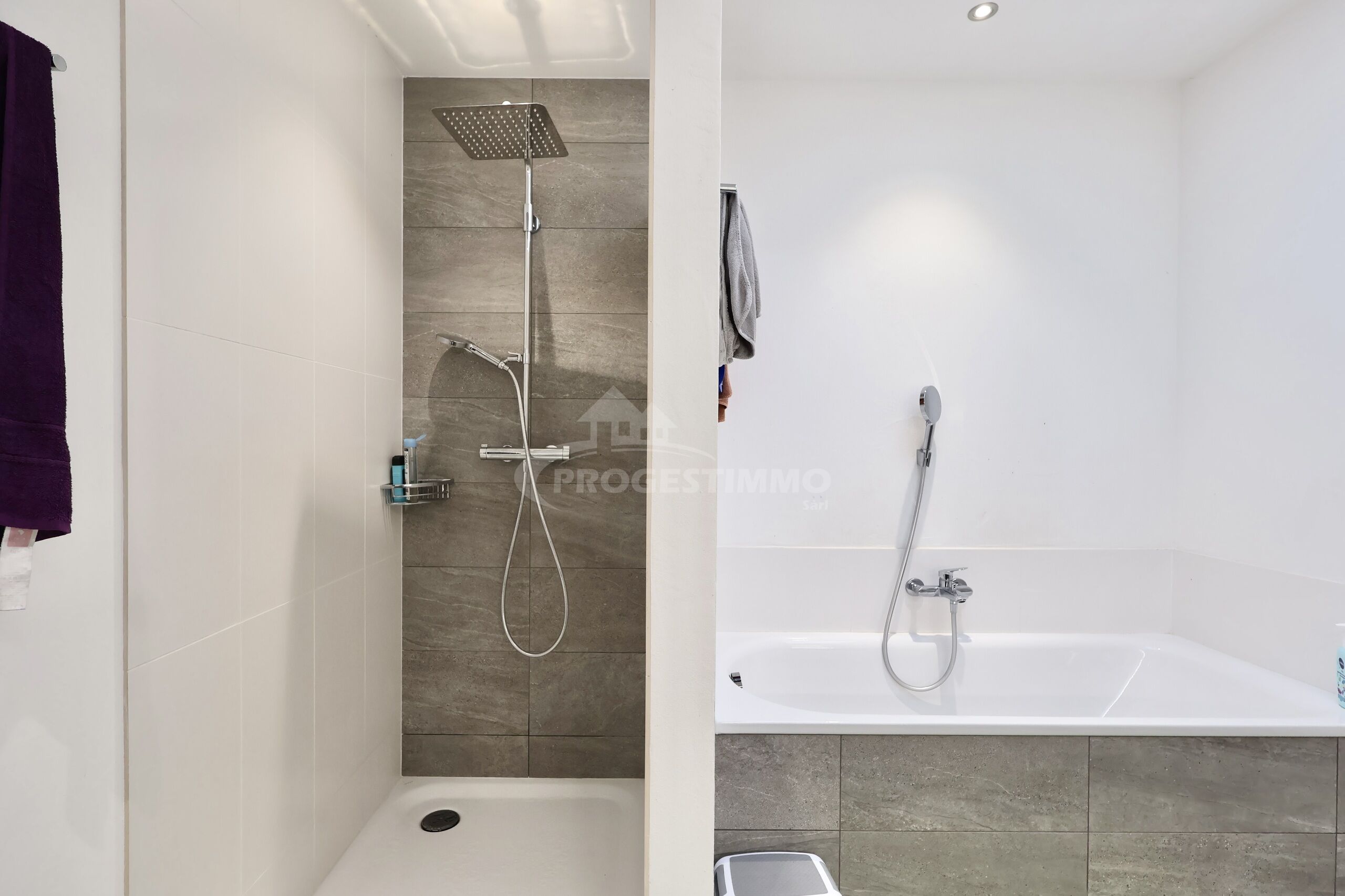 - Une salle d'eau équipée de douche, baignoire, lavabo double vasque, WC et fenêtre